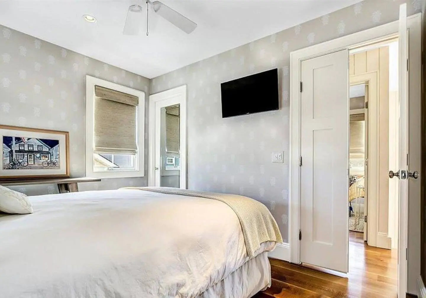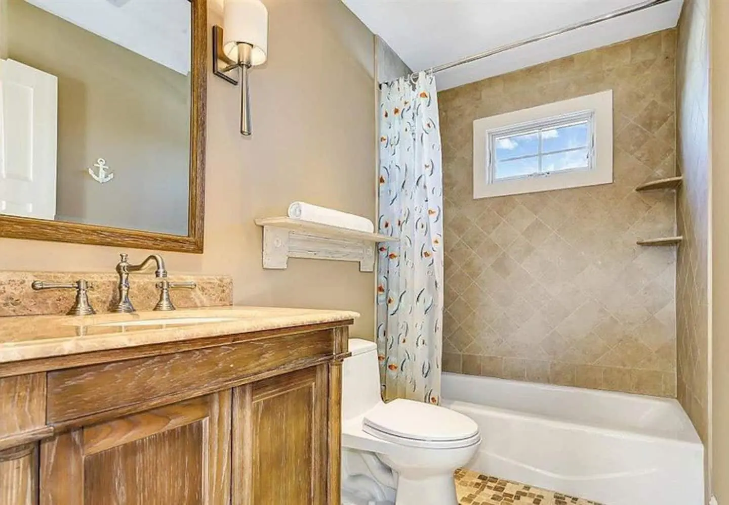 Our open living space is perfect for hanging out! Relax on the comfy sofa and catch a movie, or head to the kitchen island – it’s the perfect spot to enjoy a casual meal or morning coffee. The kitchen also has everything you need to cook up a feast, with modern appliances and plenty of counter space. And when you’re ready to call it a night, our cozy bedroom awaits, complete with a comfy queen bed and a rustic wood-paneled accent wall. The light-filled space and coastal vibes throughout make this place feel like a true home away from home.