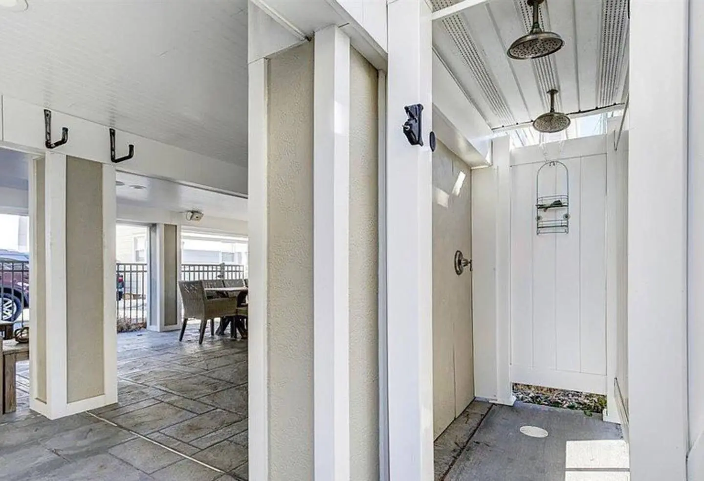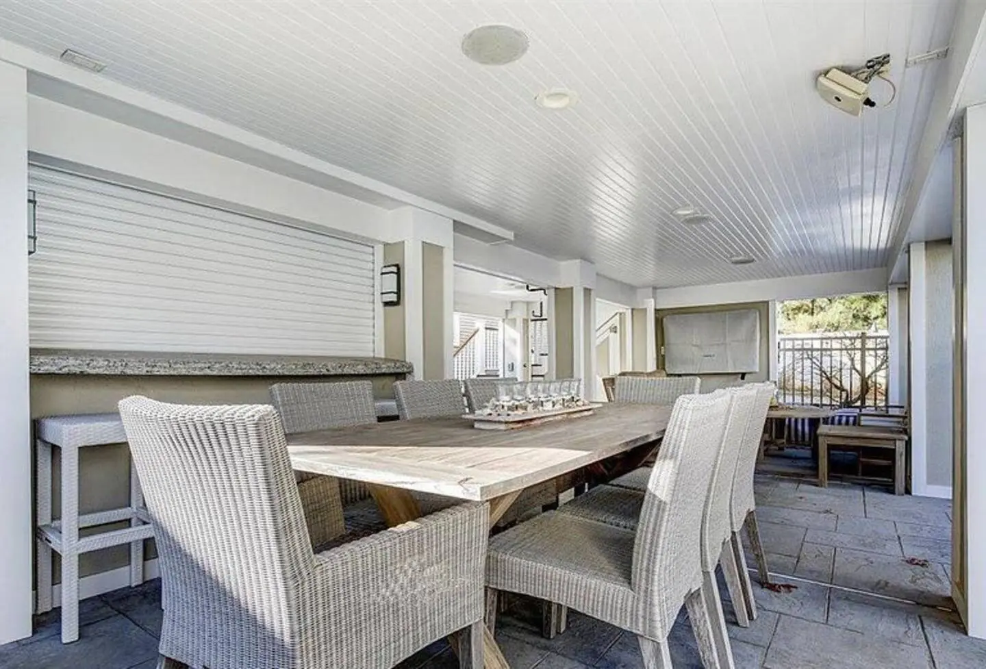 The patio, or the seating & dining area underneath the house, has a large TV that must stay covered when not in use. There is also a bar TV. The remote control in the bar room downstairs controls the larger patio TV. There is a short delay for sound the first time it’s turned on.