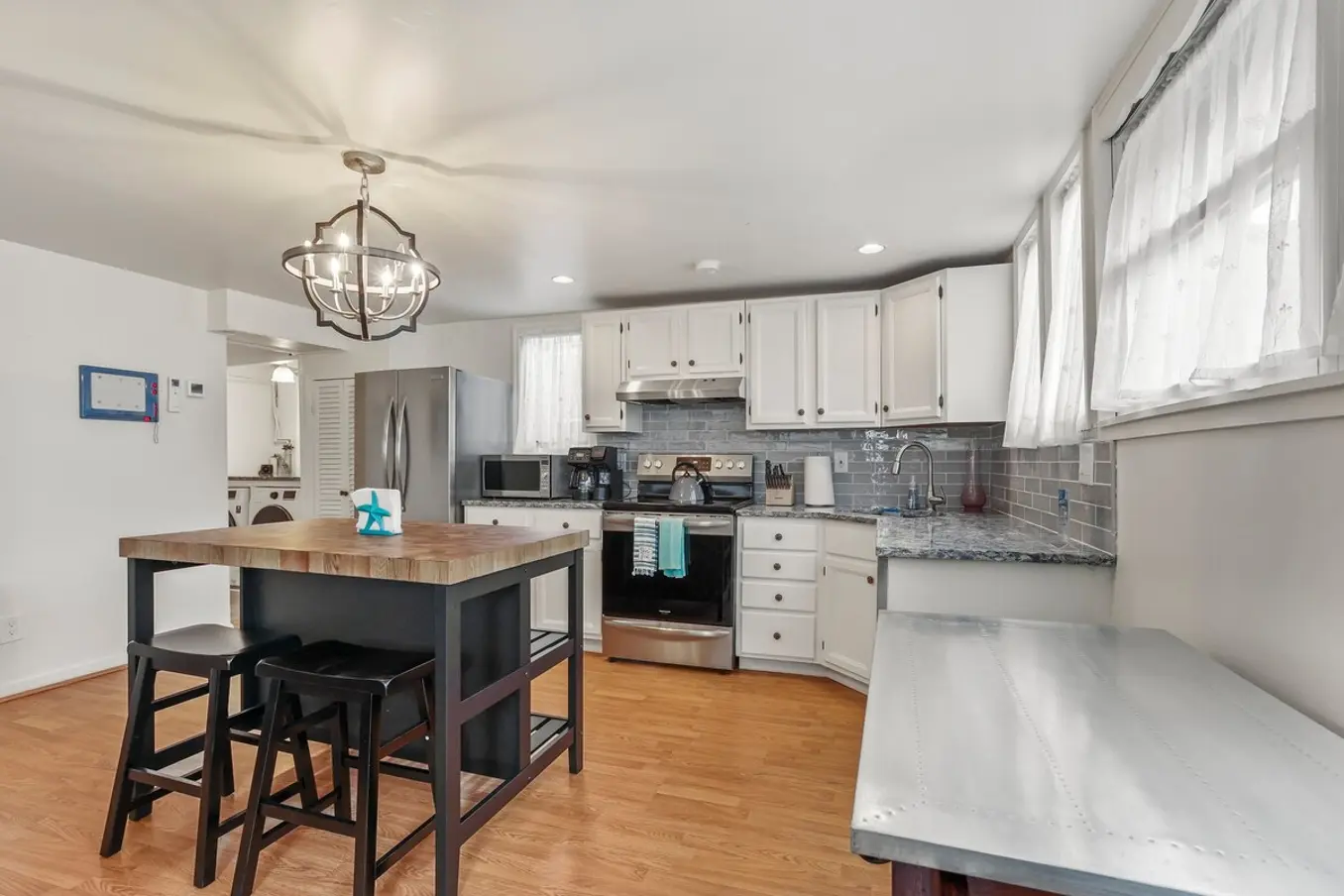 The living room is the perfect place to unwind after a day of exploring, with comfortable seating and a large, flat-screen TV. The kitchen is fully equipped with all new appliances and everything you need to prepare a delicious meal, and there is a dining table that seats eight people.