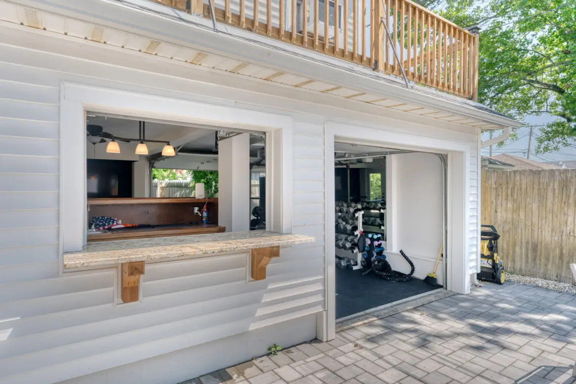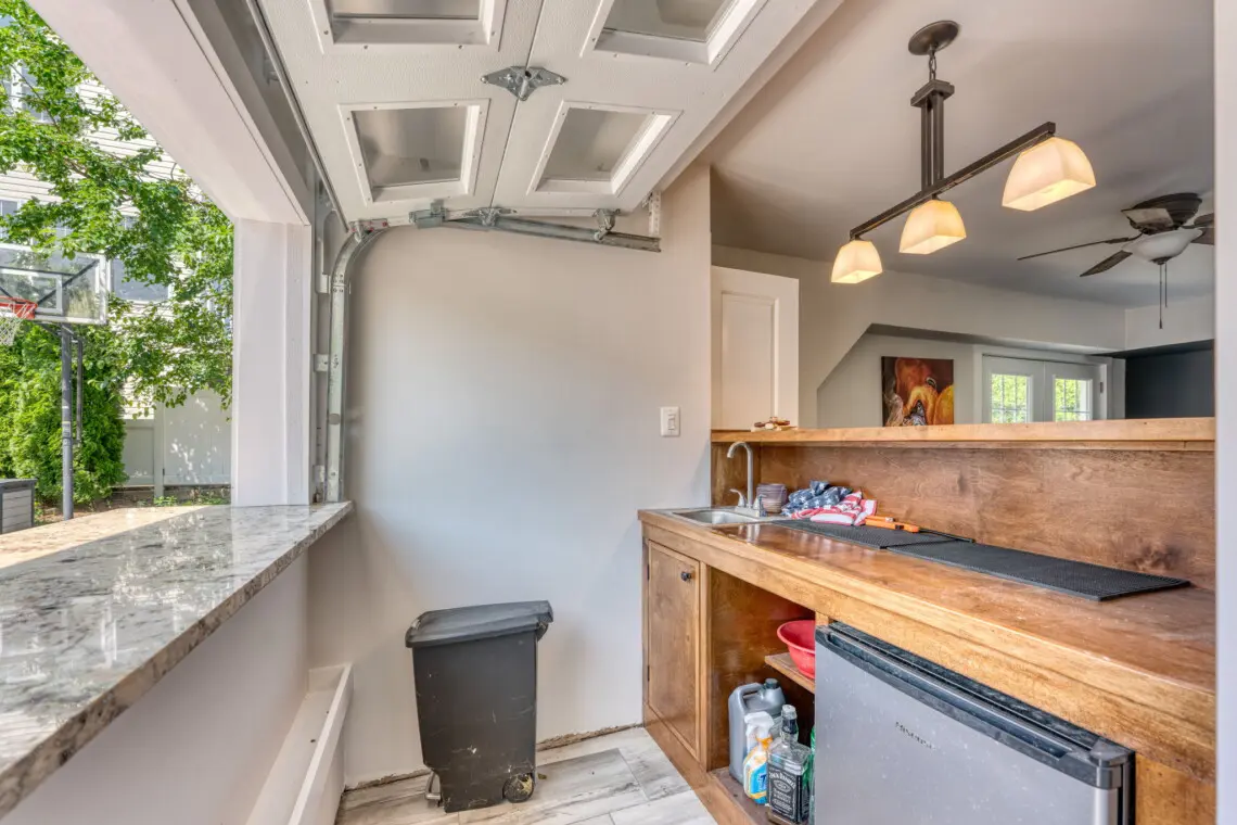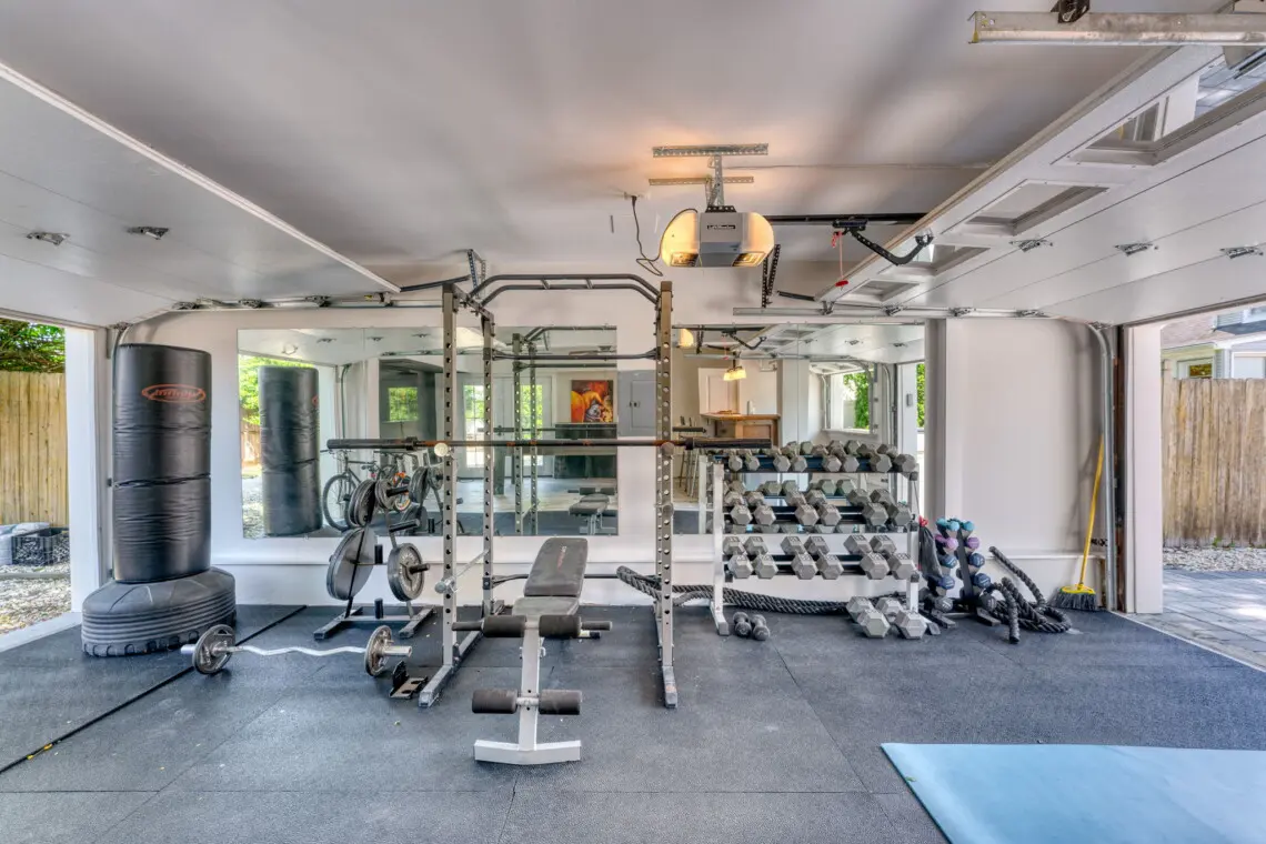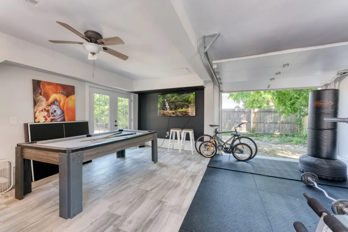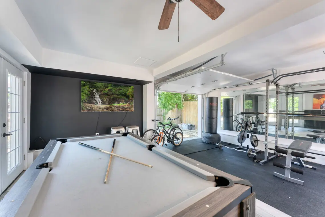 This inviting home offers the perfect blend of indoor and outdoor living. The open-concept living space features a comfy sectional sofa and a dining table, perfect for gathering with loved ones. Step out and experience outdoor living at its finest! Relax on the comfortable outdoor sectional, dine under the shade of the umbrella, or take a dip in the hot tub. For those who like to stay active, there’s a basketball hoop and a home gym to keep you in shape. In the evening, the string lights create a festive atmosphere for gatherings.