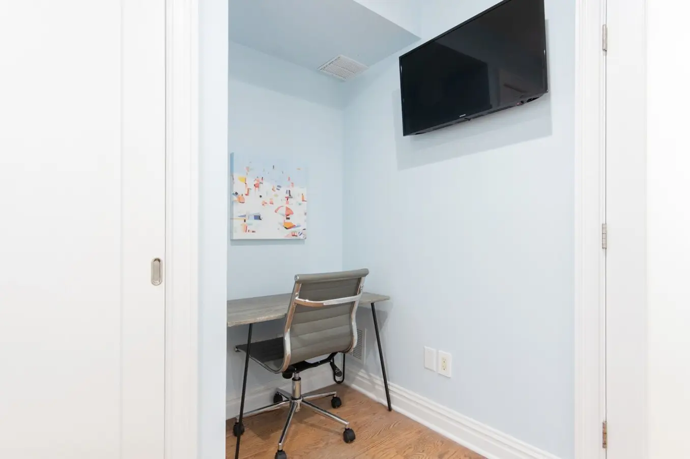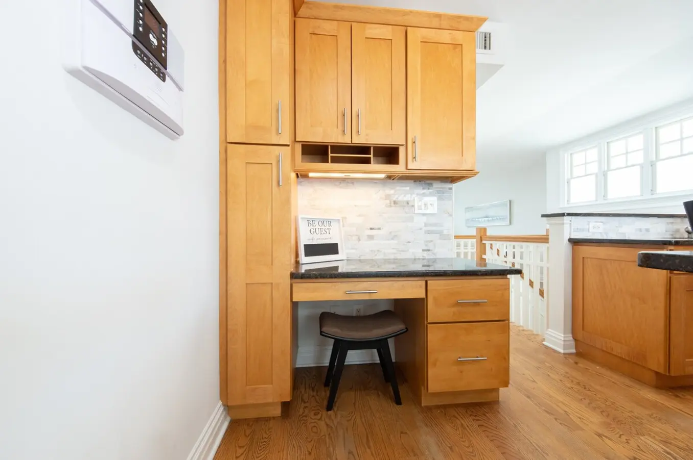 – Bedroom 1 is on the first floor with a queen bed, private en suite bathroom, and an office nook with a desk for remote work.