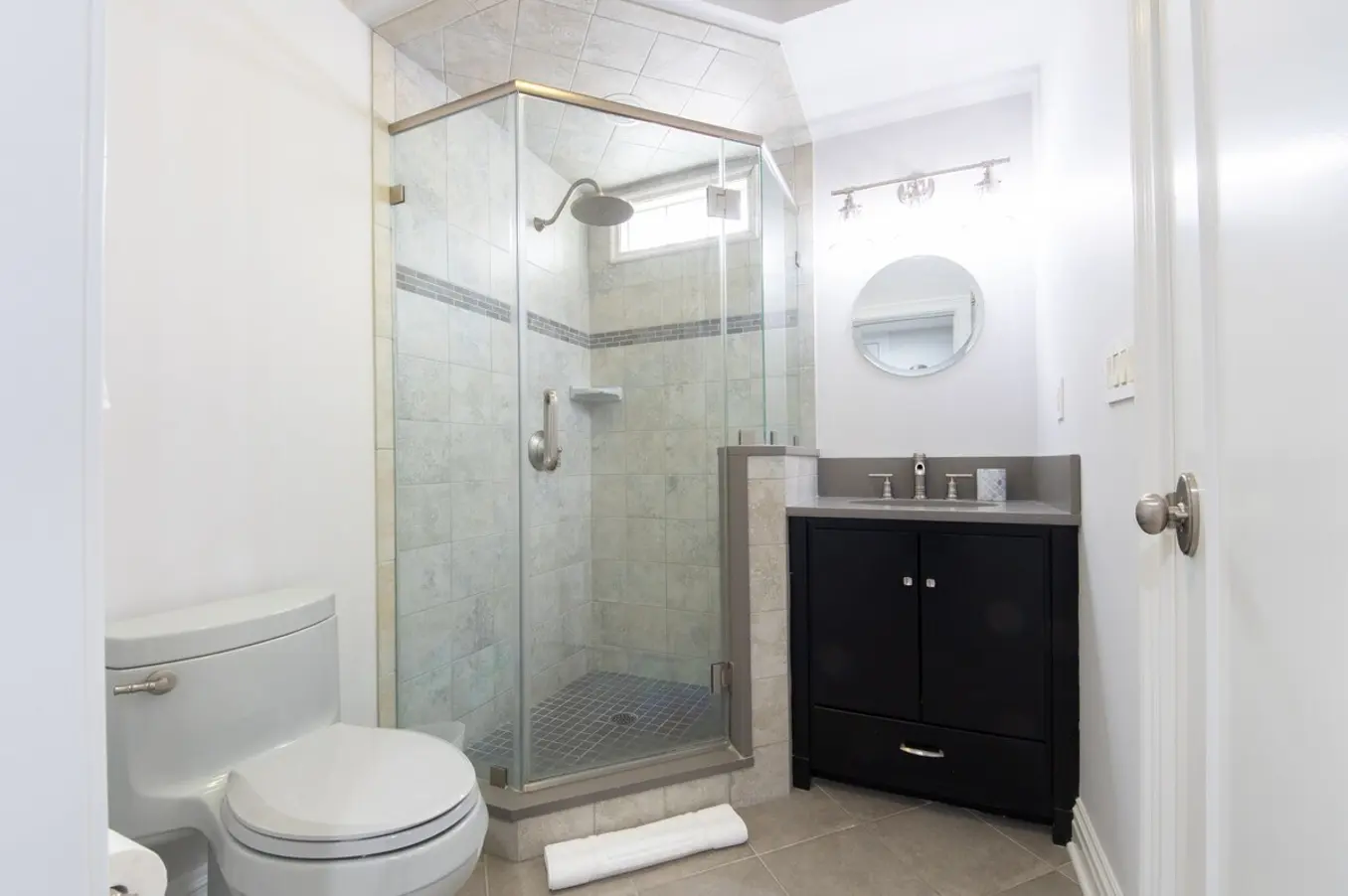 Each bedroom has its own private on suite bath and there’s an additional half bath off the living room. Our reverse living setup has bedrooms on the first 2 floors with the living room and kitchen on the top floor.